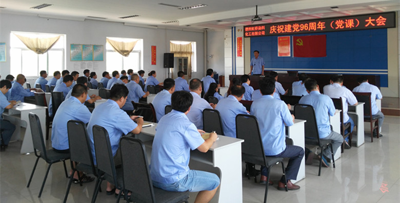 德州虹橋染料化工有限公司三個(gè)支部的全體黨員于2017年7月8日上午9點(diǎn)在公司辦公樓4樓黨員活動(dòng)室進(jìn)行了“慶祝建黨96周年(黨課)大會(huì)”學(xué)習(xí)。這是今年以來(lái)3個(gè)支部全體黨員第一次集體學(xué)習(xí)。黨課開(kāi)始前,全體黨員站在黨旗下,莊嚴(yán)的重溫入黨誓詞(視頻播放)。本次黨課學(xué)習(xí),由公司董事長(zhǎng)黨總書(shū)記吳高樓主持,在紀(jì)念我黨建黨96周年之際,公司黨總支委員總經(jīng)理申書(shū)信同志以“化工行業(yè)安全”為主題,講了德州虹橋染料化工有限公司當(dāng)前面臨的生產(chǎn)安全環(huán)境和實(shí)際困難,用近期周邊其他化工單位發(fā)生的安全事故,聲情并茂,娓娓道來(lái),為黨員們敲響安全的警鐘。黨員們對(duì)安全生產(chǎn)的認(rèn)識(shí)又提高了一個(gè)層次。吳總要求黨員們要積極發(fā)揮黨員的先鋒模范作用,以實(shí)際行動(dòng)為榜樣,帶動(dòng)德州虹橋所有職工牢記安全生產(chǎn),人人有責(zé)。。