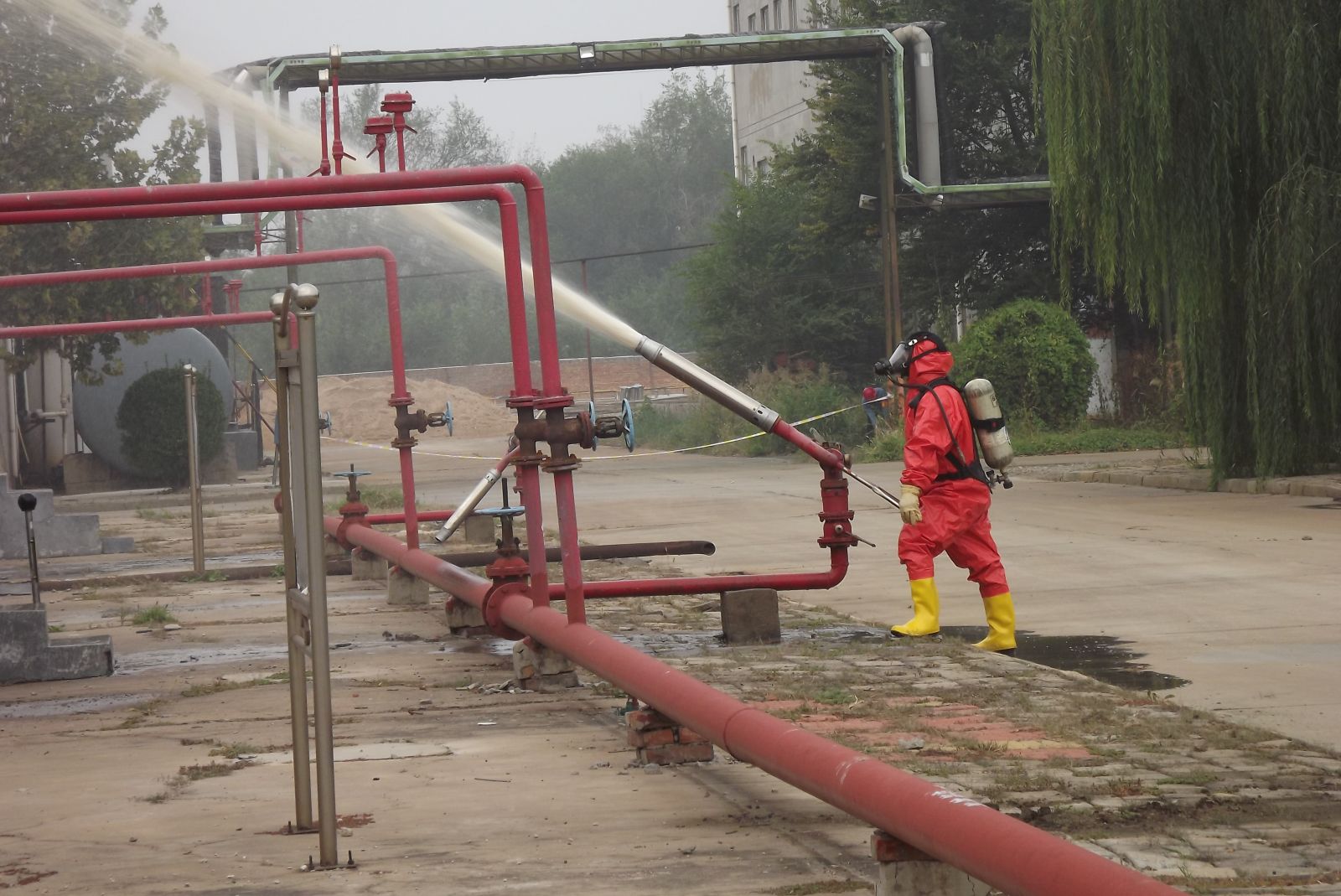 德州虹橋染料化工有限公司生產(chǎn)部為增強(qiáng)公司各部門生產(chǎn)防范意識和提高應(yīng)急處置能力,強(qiáng)化應(yīng)對各類突發(fā)事故的處理技能,提高職工快速反應(yīng)能力以及各部門協(xié)同作戰(zhàn)能力,確保在發(fā)生突發(fā)事故時(shí),能夠有效組織,快速反應(yīng),臨危不亂,最大限度地減少危害事故的發(fā)生。2019年10月11日上午組織公司各部門員工在硝基苯儲罐區(qū)進(jìn)行了應(yīng)急消防演練。